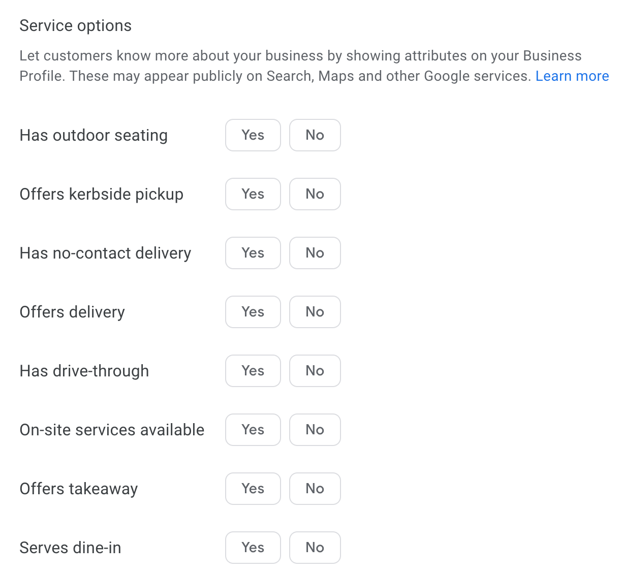Google offers a predefined list of services for most categories. For a pizzeria, you’ll want to include things like: