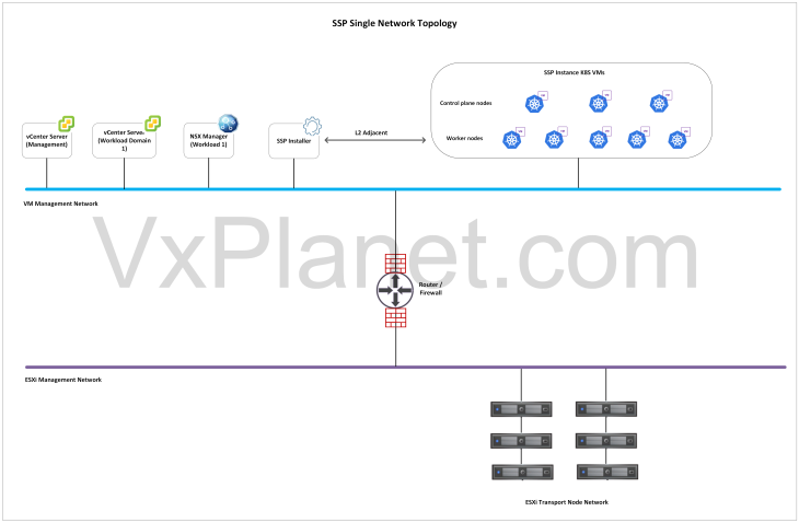 Single Network Topology: In this topology, both SSP Installer and SSP Instance will be deployed on a single network (VLAN backed or NSX overlay). Ideally this network will be the management network that has L2 adjacency with the other VCF management components like vCenter, NSX etc. If this network is separate from the management network, the necessary firewall ports between the components as described in the requirements section needs to be enabled.