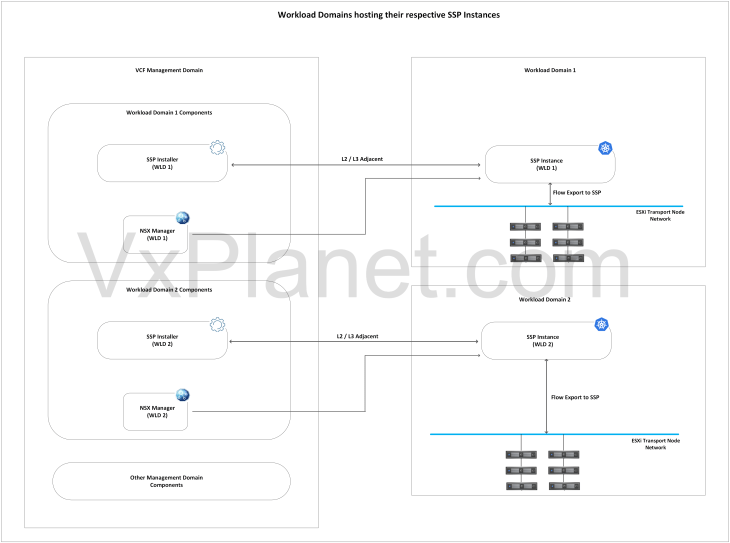 SSP Instances co-located with the workload domain: In this deployment option, the SSP Installers of the workload domains will be hosted on the management domain, whereas the SSP instances will be hosted on their respective workload domains. As VCF scales out to additional workload domains, SSP instances can scale out linearly along with the workload domains without constraints to the management domain sizing. This option is preferred when management domain has sizing constraints to host the SSP instances.