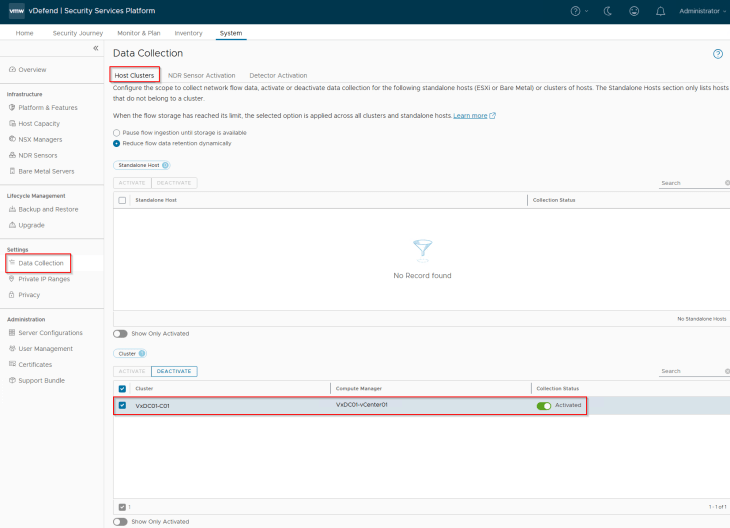 Once Security Intelligence is activated, navigate to System -> Data Collection -> Host Clusters and activate flow collection for the vSphere cluster. This will enable flow exporter service on the transport nodes in the cluster to send flow information to Security Intelligence.