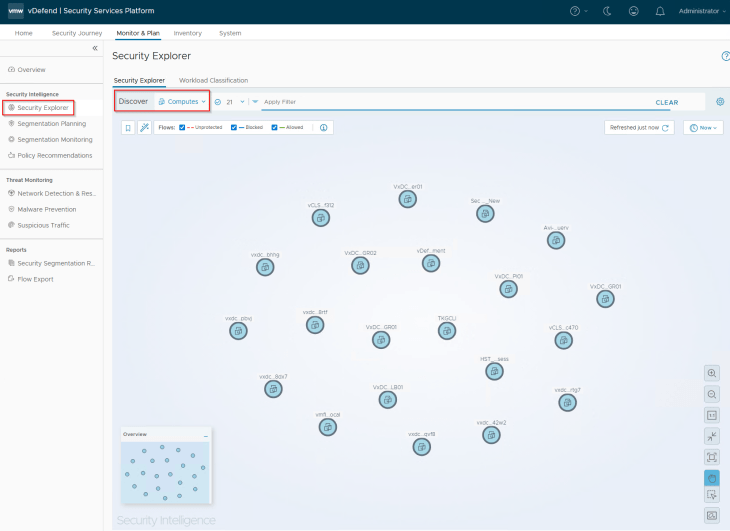 Now let’s navigate to Monitor & Plan -> Security Explorer and confirm that we can access the flow visualization dashboard. We will not see any flows currently, as all the workloads displayed in the canvas are on VLAN backed port groups, and we don’t have any applications onboarded yet. We will do that from Part 4 onwards.