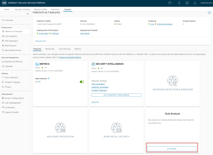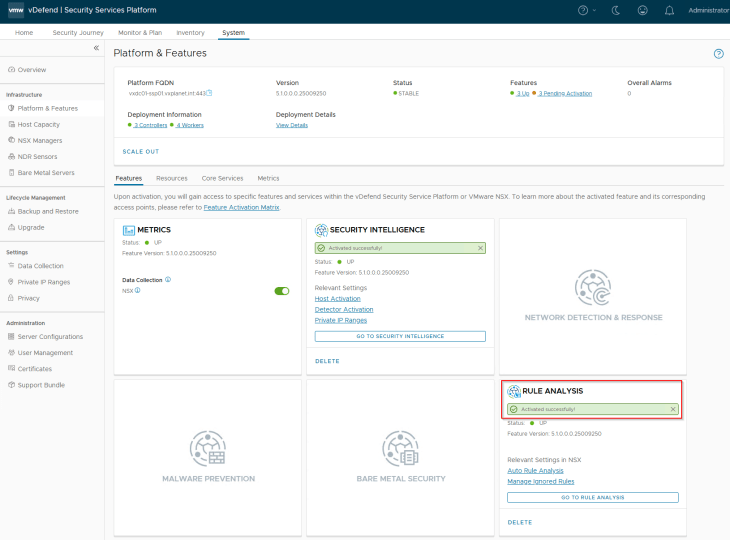 Navigate to System -> Platform & Features and click on the Rule Analysis tile to activate. Make sure that the SSP platform is healthy and we don’t have any open alarms in the console before feature activation.