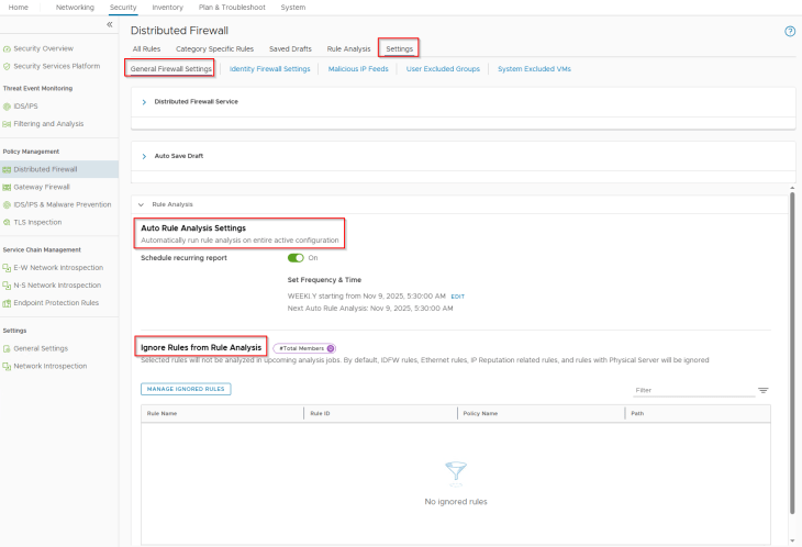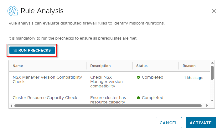 Once the feature is activated, we see a new tab for Rule Analysis under the Distributed Firewall section in NSX manager.