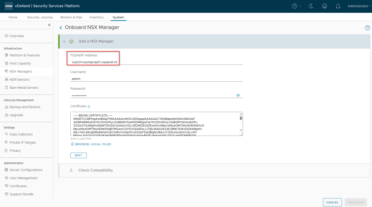 It’s recommended to provide the cluster VIP address to remain connected to SSP in case of an NSX node failure. The workflow requires NSX management cluster Rest API certificate (named as MGMT_CLUSTER REST VIP) to be presented in order to establish trust with the NSX manager.