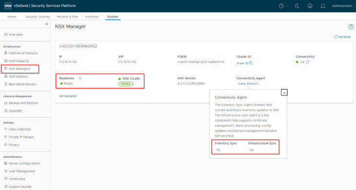Once onboarding is successful, NSX Inventory Sync and Infrastructure Sync agents in SSP should have a status of UP and the connectivity status should be Stable.