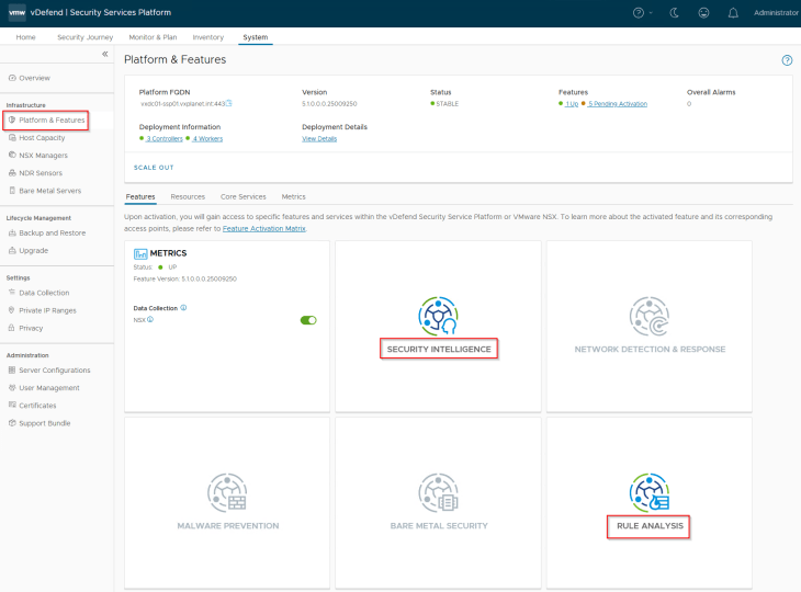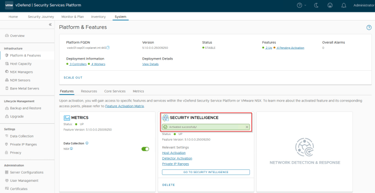 Let’s navigate to System -> Platform & Features and click on the Security Intelligence tile to activate. Make sure that the SSP platform is healthy and we don’t have any open alarms in the console before feature activation.