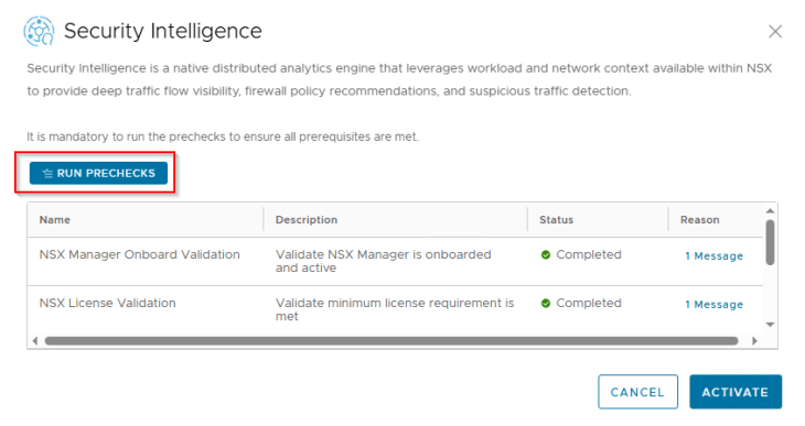 Based on the vDefend license applied to NSX manager, we have Security Intelligence and Rule Analysis features available to activate.