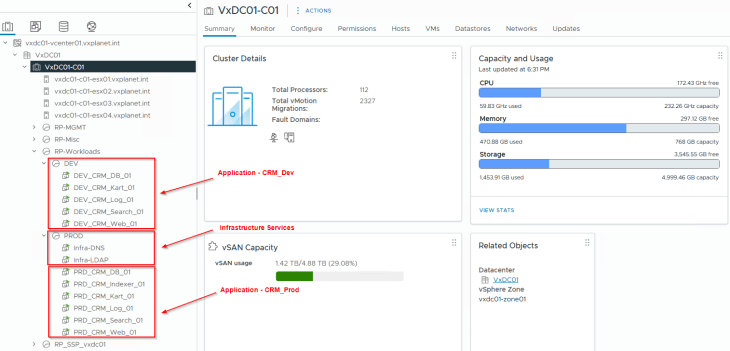 To demonstrate a full hierarchy import, I have deployed two applications and a few dependent infrastructure services in vCenter across two resource pools Prod and Dev.