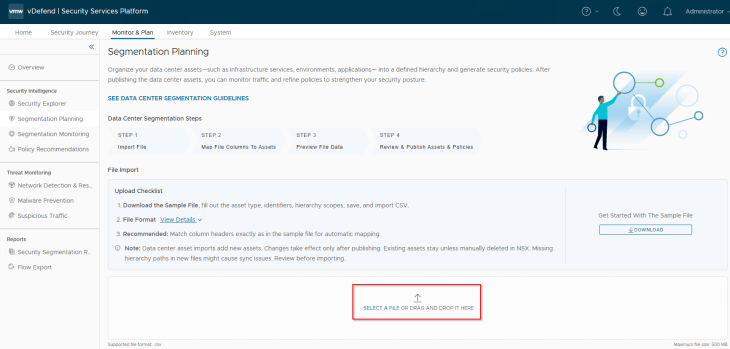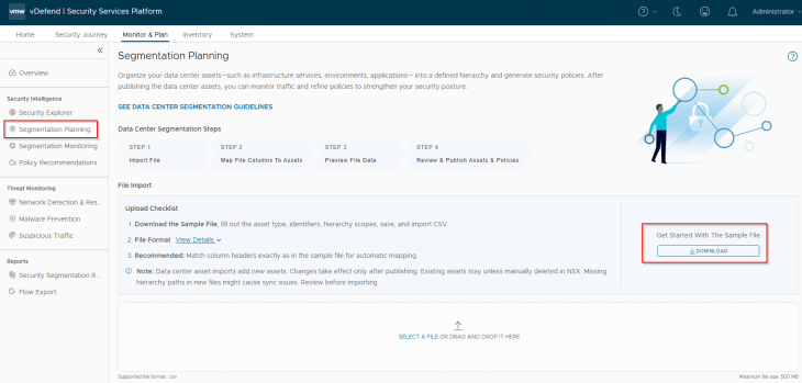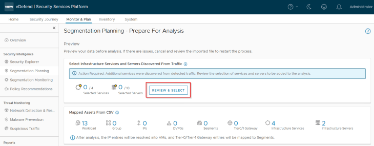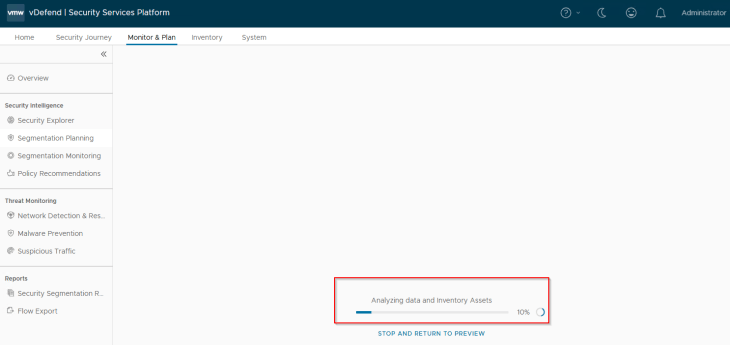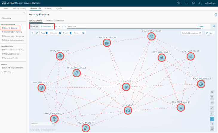 The first step before the segmentation activity is to generate the segmentation score and report. The segmentation score is based on the current security posture based on DFW configuration (like the necessary infrastructure, environment, application rules) and the volume of unprotected flows in Security Intelligence.