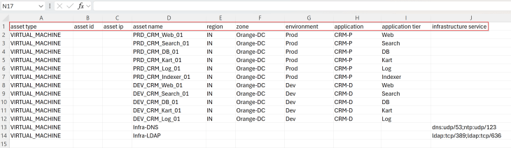- If the use case is around environment segmentation, it’s mandatory to have environment column and recommended to have the application column. This is because inter-environment exceptions rules are created based on application groups