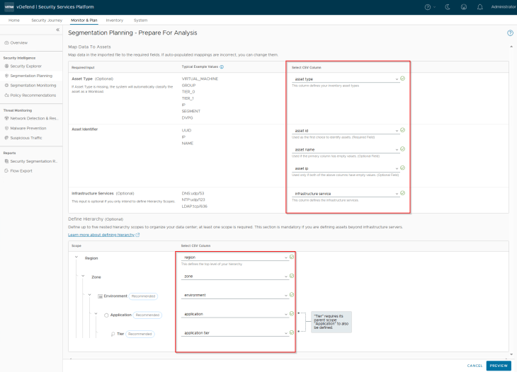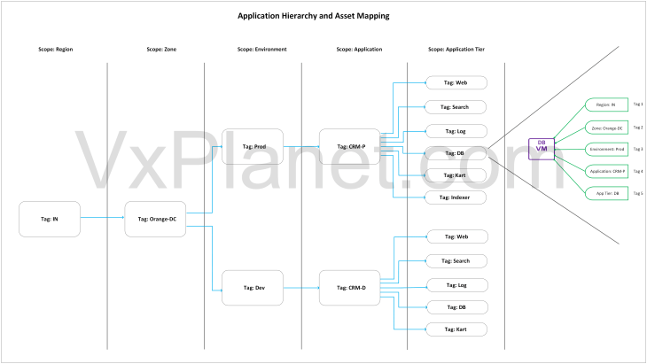 VMs are assigned tags based on the hierarchy, where each hierarchy column header maps to a scope and the respective column value maps to a tag. SSP inventory assets and NSX security groups are created based on dynamic tag-based criteria that maps to regions, zones, environments, applications and application tiers.