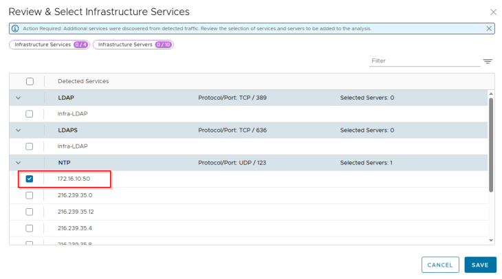 Under NTP, we see a lot of entries and most of them are public endpoints which can be excluded (unless it’s required). We will include some internal NTP servers from this list.