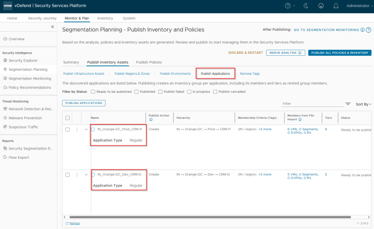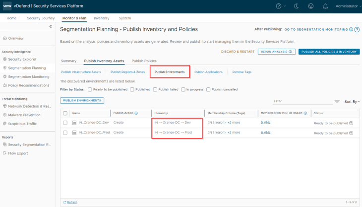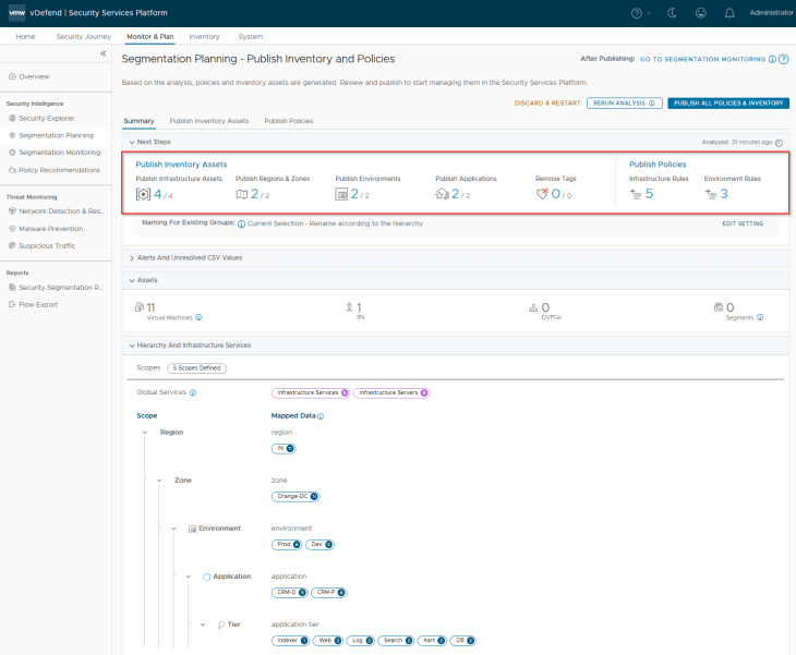 Below are the Environment assets recommended for publishing. They will be mapped as dynamic tag-based security groups in NSX manager.
