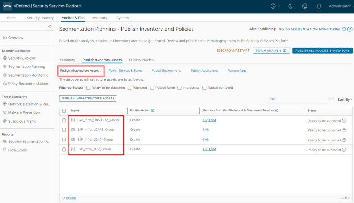 Below are the Infrastructure assets that are available for publishing. They will be mapped as static security groups in NSX manager. Each asset represents an infrastructure service like NTP, DNS, LDAP etc