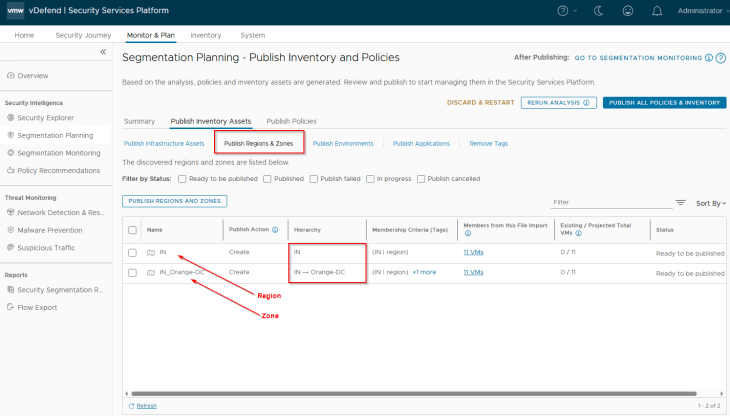 Below are the Region and Zone assets recommended for publishing. They will be mapped as dynamic tag-based security groups in NSX manager.