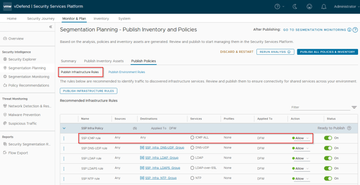 Below are the Infrastructure rules that are recommended for publishing. Notice the default ICMP rule at the top of the ruleset. If the enterprise does not permit ICMP, change the action to Deny / Drop. Lockdown policies will be implemented later as part of segmentation monitoring in Part 6.