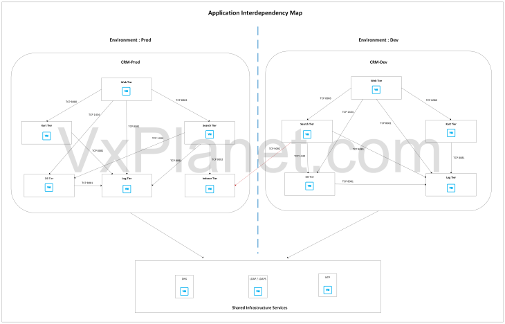 This is how the application interdependency map looks like. Note that there is an inter-environment communication between the CRM-Dev Search Tier and the CRM-Prod Indexer Tier.
