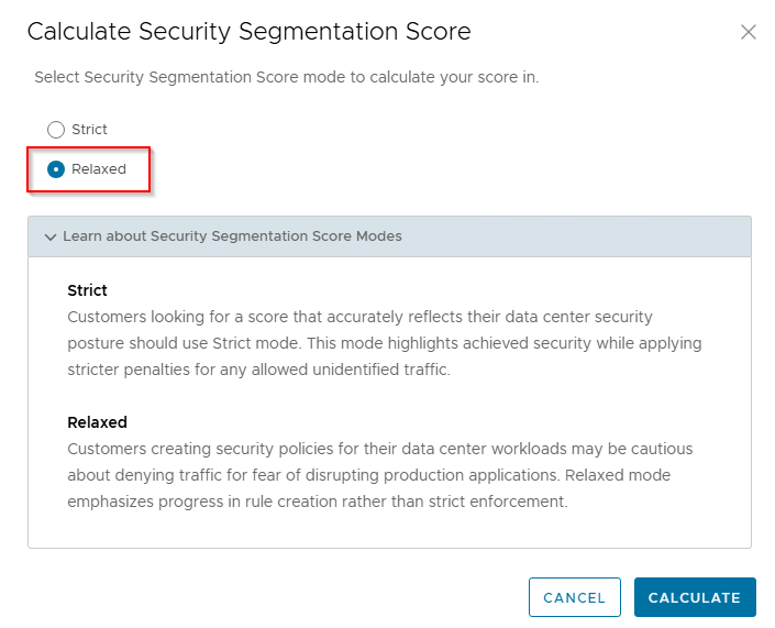 We will choose Relaxed mode as it applies lesser penalties to score calculations, and since we are currently in the process of segmentation journey, this mode only emphasize in rule creation progress rather than assessing lockdown rules which we don’t have currently.