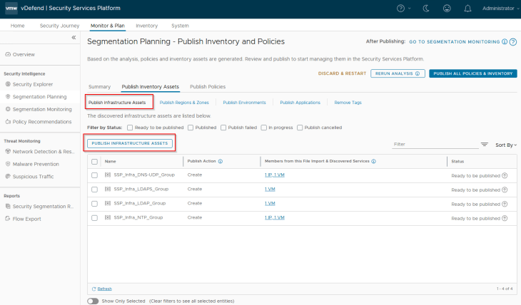 Navigate to Segmentation Planning -> Publish Inventory Assets -> Publish Regions and Zones, select the regions and zones that are recommended and click on Publish. During the initial publish we see the publish action as ‘Create’, however it’s also possible that the regions or zones may already exist as part of a previous import. In this case, we see the action against those assets as ‘Refresh’ as this process updates the existing asset’s membership with additional members or make changes in the assigned tags. We also have another publish action called ‘Promote’ in scenarios where we promote an existing NSX Group as Region or Zone in SSP.