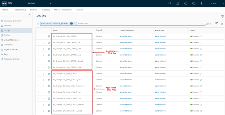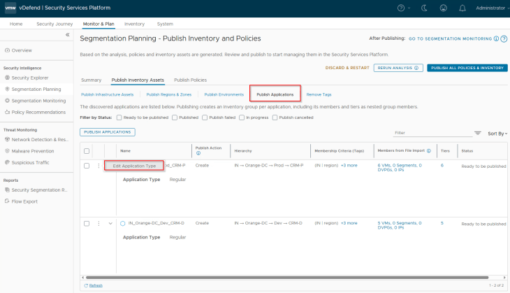 Now let’s select the two applications (CRM-P and CRM-D) and click on Publish. Note that applications are named based on the hierarchy unless we are promoting existing groups from NSX.