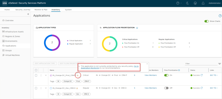 A warning sign next to the Application assets means that there are no DFW policies associated with the application. This is expected, as we haven’t reached that stage yet.
