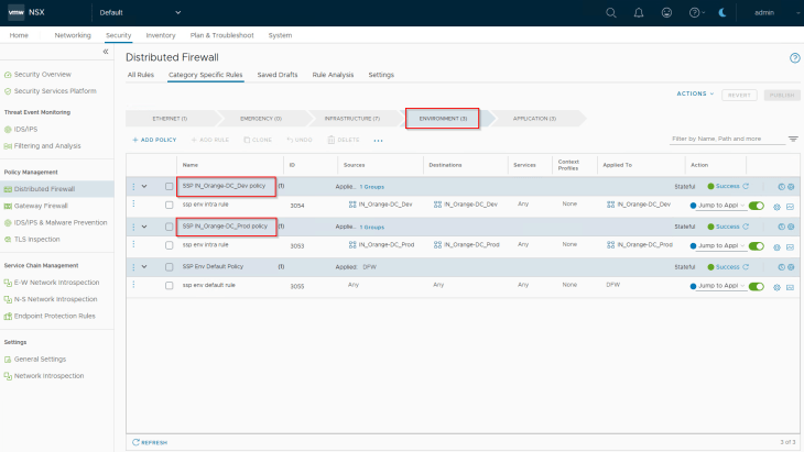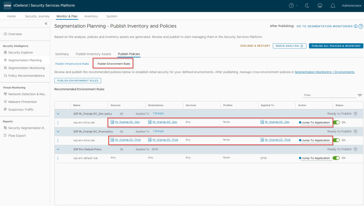 Navigate to Segmentation Planning -> Publish Policies -> Publish Environment Rules, and hit on Publish. The default environment rules are only intra-environmental with an action of ‘Jump to Application’ that allows the traffic to be further analysed against Application category microsegmentation rules. Changing the action to ‘Allow’ simply means Environment / zone segmentation use case, where the traffic is allowed and is not analysed against Application category rules.