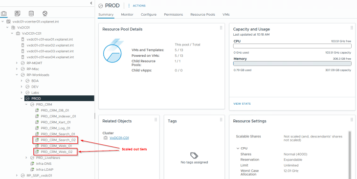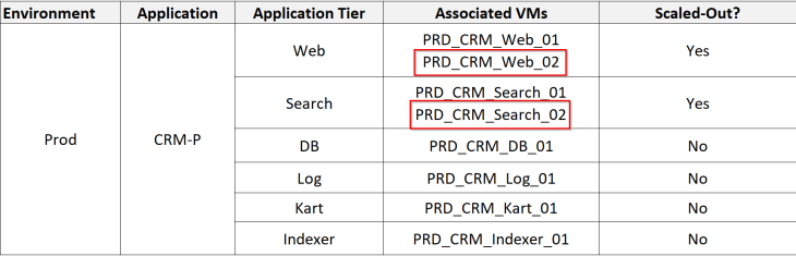 The below table shows the CRM Prod application details, including it’s tiers, existing VMs and scaled-out VMs (highlighted)