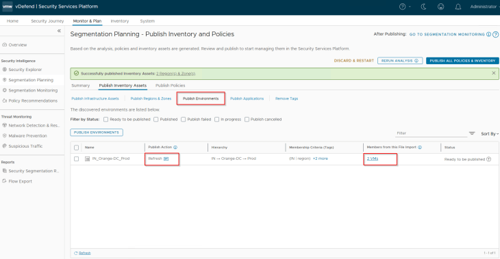 Since the Environment asset was already present in SSP as part of previous hierarchy import, we again see the publishing action as Refresh. This publishing action will update the VMs with Environment tag (as highlighted below)