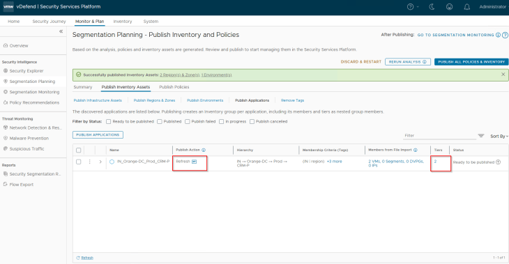 Since the Application and Application tier assets were already present in SSP as part of previous hierarchy import, we again see the publishing action as Refresh. This publishing action will update the VMs with Application and Application tier tags (as highlighted below)