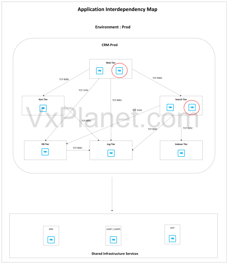 This is how the application interdependency map looks like. Note that there is no change in the application architecture except that the web and search tiers are scaled out with additional VMs (highlighted)