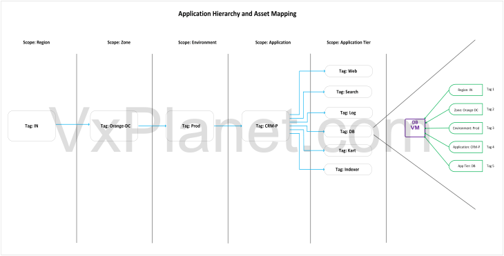 This is a preview of the assets and hierarchy that are mapped from the csv. Notice the five scopes and the different tags that will be applied to the VMs included in the csv.
